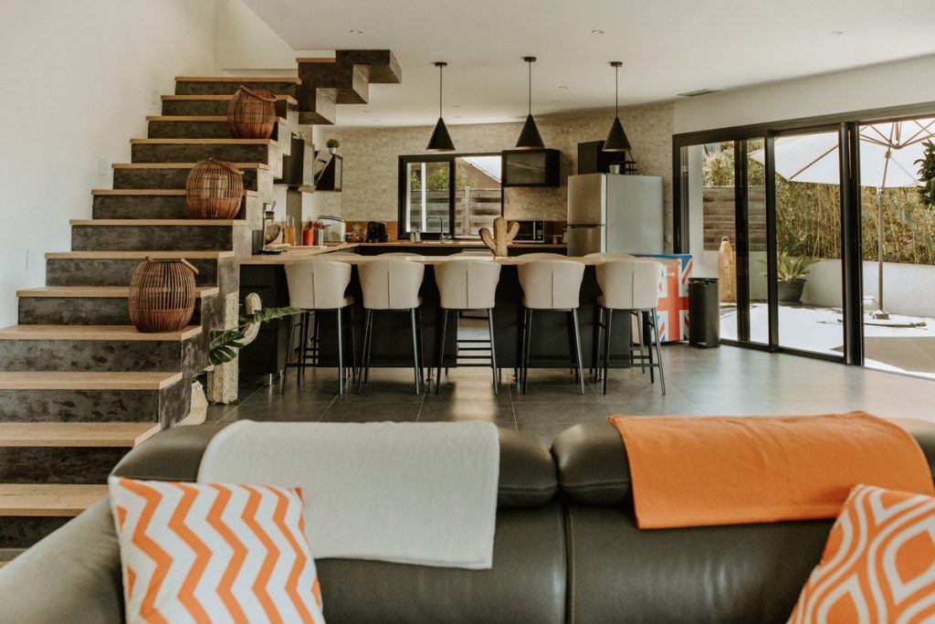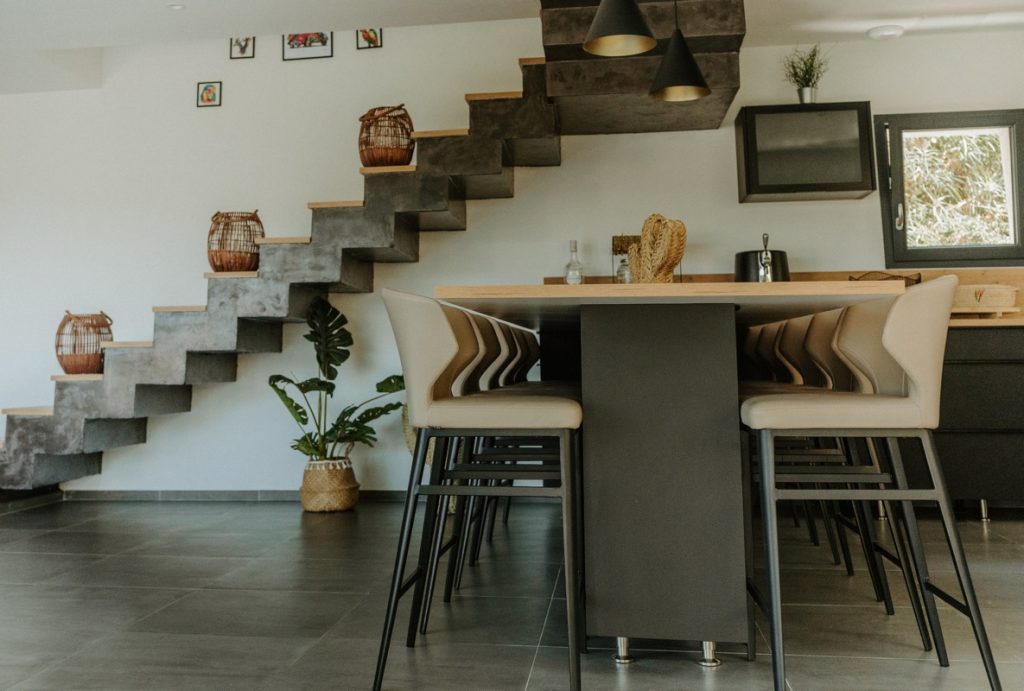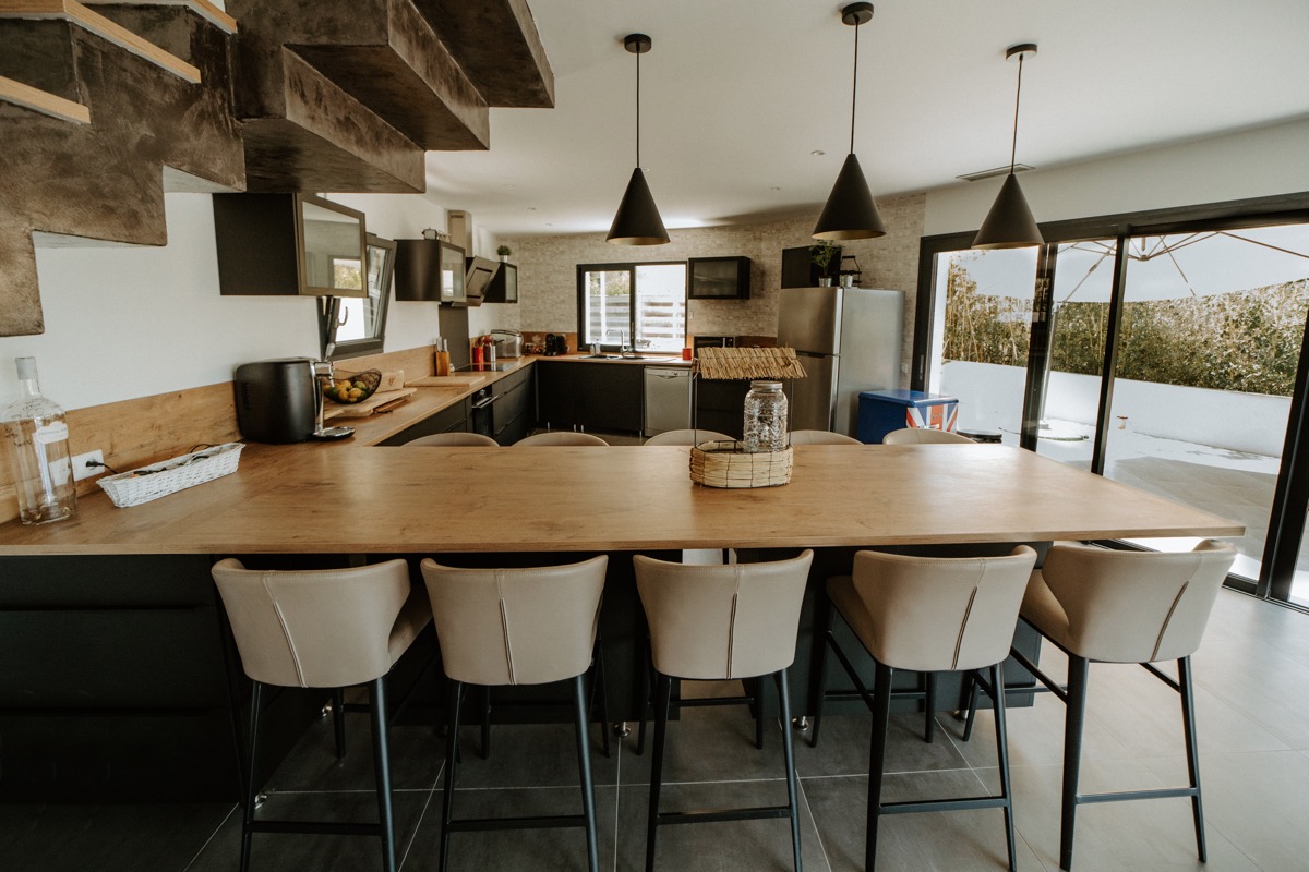 Une table îlot de 10 à 12 personnes en fait le cœur de la « Mulleterie ». De la cuisine, vous pourrez suivre toutes les conversations et profiter de votre entourage tout en préparant le repas.