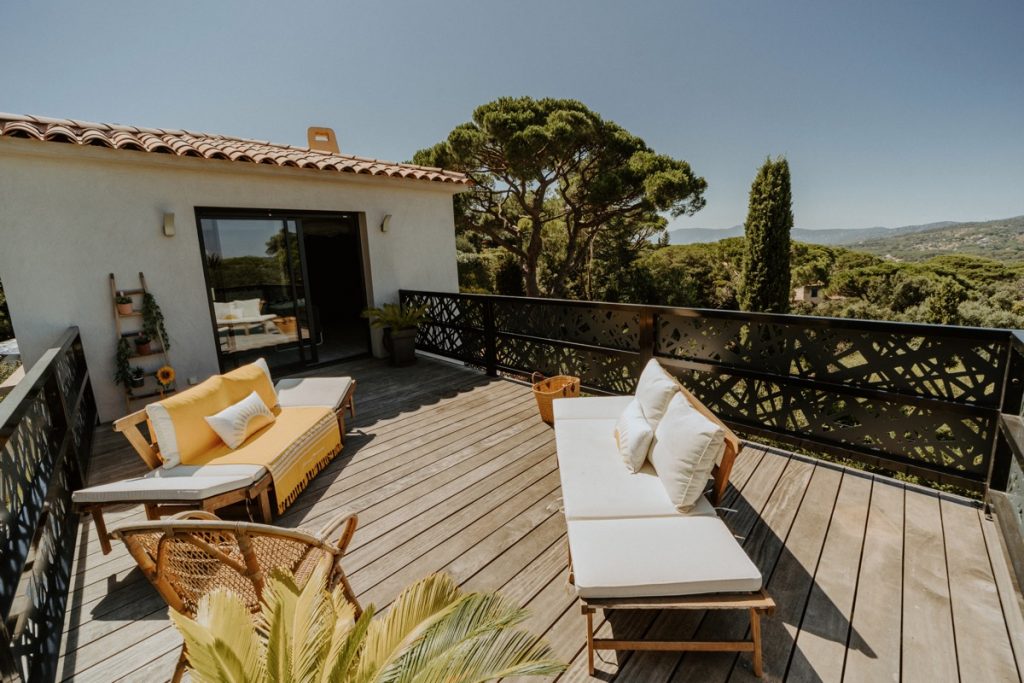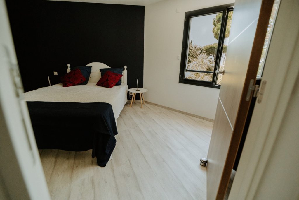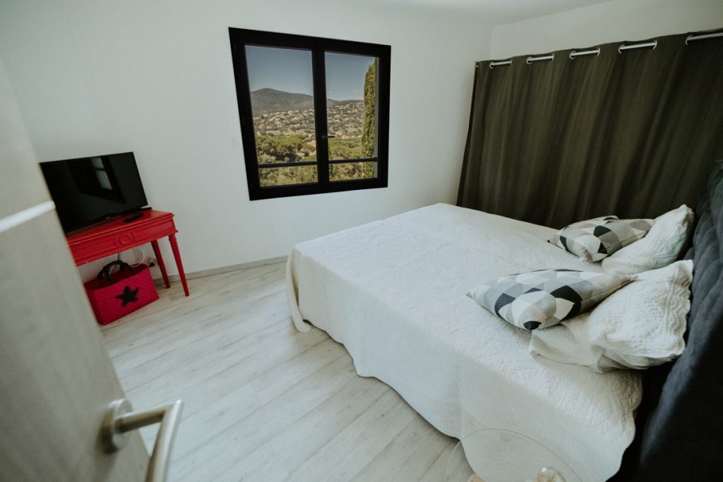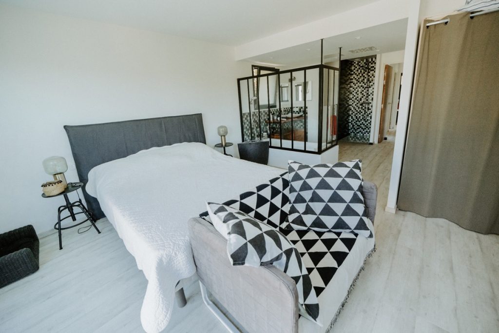 Superbe chambre avec sa literie neuve de 160×200. Une baie vitrée permet d’accéder au solarium avec son revêtement en bois ou vous pourrez vous installer dans un petit salon de jardin avec ses coussins. Prenez un peu de temps pour vous, regarder les étoiles et les petites lumières environnantes qui scintillent à la tombée de la nuit après une bonne douche ou un bon bain. Le moment favori de mes 2 filles est de se retrouver à cet endroit pour papoter ou regarder la vue tranquillement.