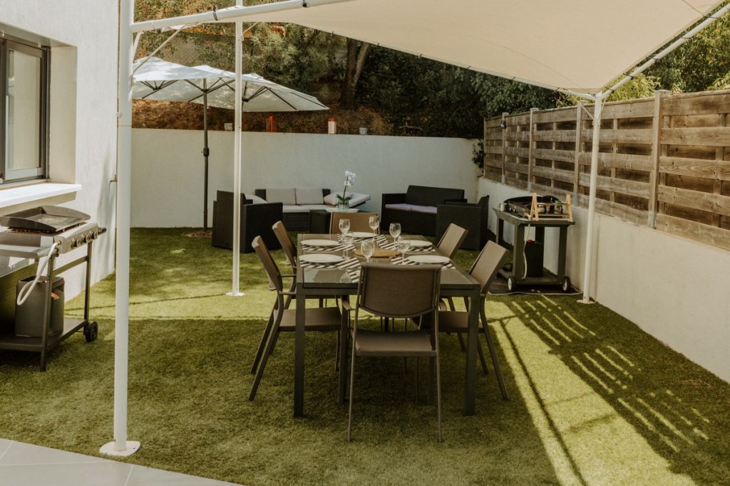 2 grandes terrasses autour de la maison agrémentées de 2 grands salons de jardin avec plancha vous attendent pour prendre le rosé avec votre famille, vos amis. Mais laquelle choisir ? Celle sur la pelouse ou celle près des pins, toutes 2 abritées par 1 voile d’ombrage ou par 1 parasol. Pour passer à table, vous trouverez une table de 10 personnes sur une autre partie de la terrasse, abritée par un parasol double qui recouvre l’ensemble pour déjeuner à l’ombre.
